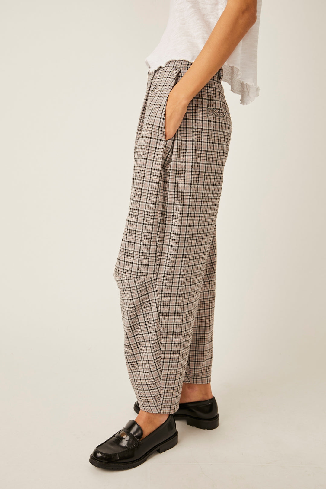 - Features: Zip fly, side pockets, pleating at top, ankle-length inseam