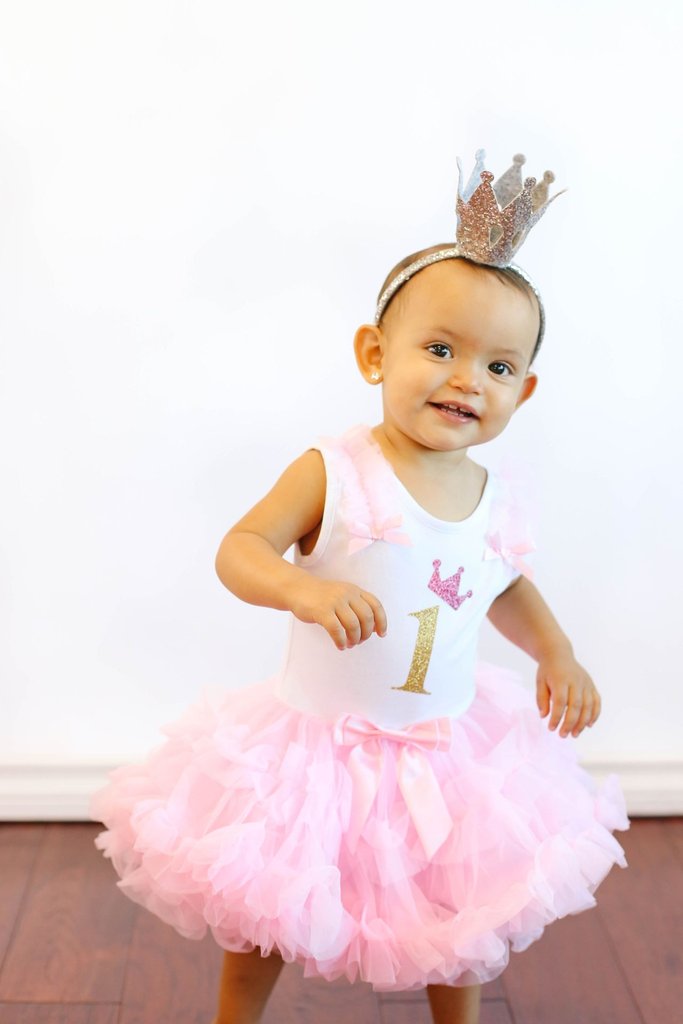 A white first birthday ruffle petti dress with pink ruffle skirt and number 1 printed in gold glitter. Shoulder straps are embellished with pink ruffles and satin bows.