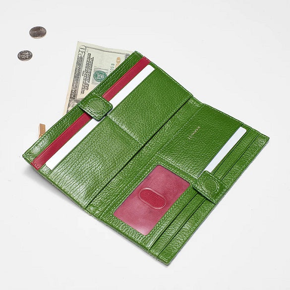 - Interior: Two drop pockets, ten credit card slots, one clear ID slot