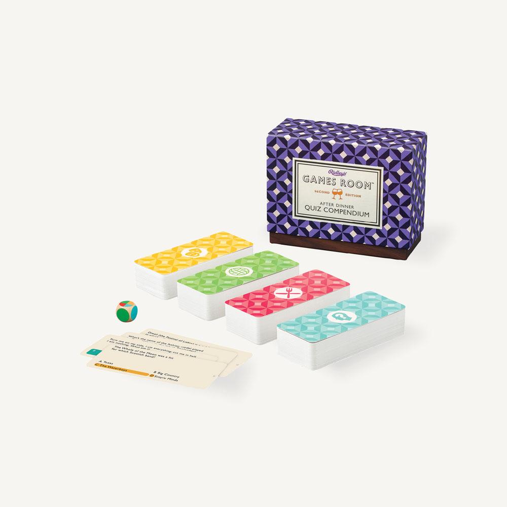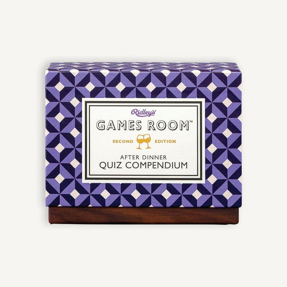 The perfect way to end a meal: grab a digestif and gather around to play this After Dinner Quiz Compendium from Ridley's Games. Put your knowledge to the test with this series of Culture, Food & Drink, Travel and Who Am I quizzes. Simply take turns to roll the die and answer the corresponding quiz card to begin the fun. Includes 4 x 70 game cards, decision die and instructions. Packaged in a stylish geometric patterned 2 piece box.