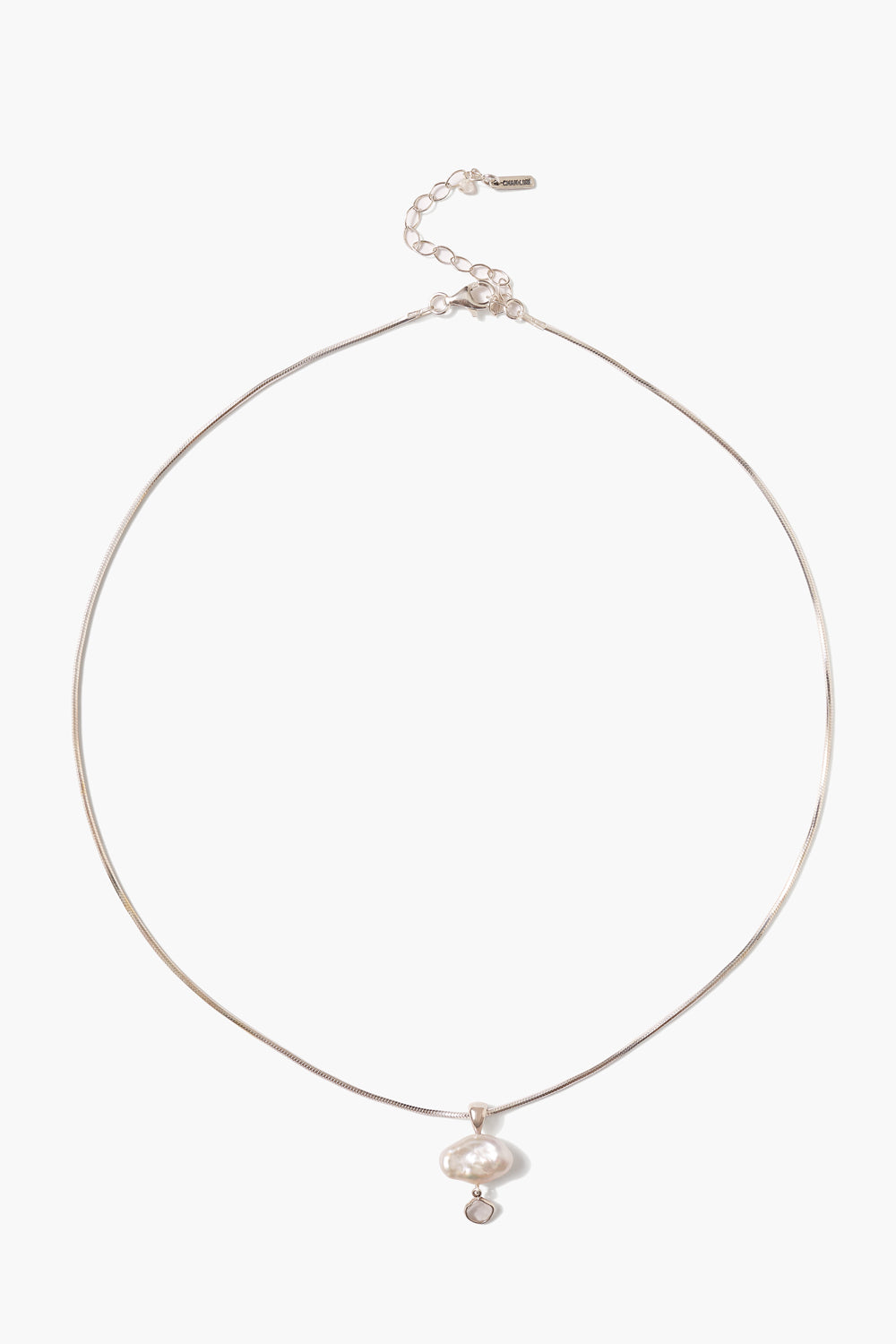 WHITE PEARL AND DIAMOND CHARM SILVER NECKLACE