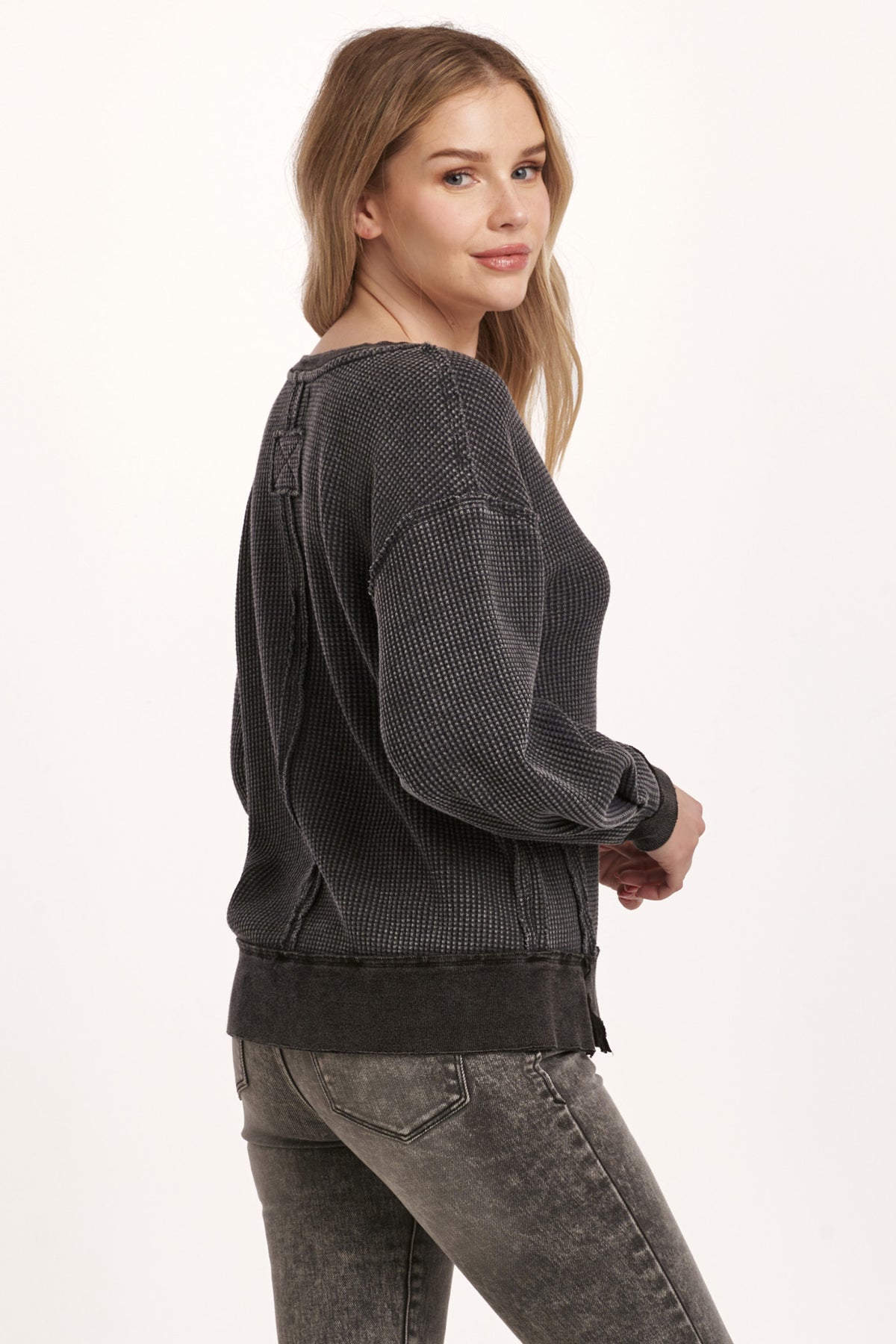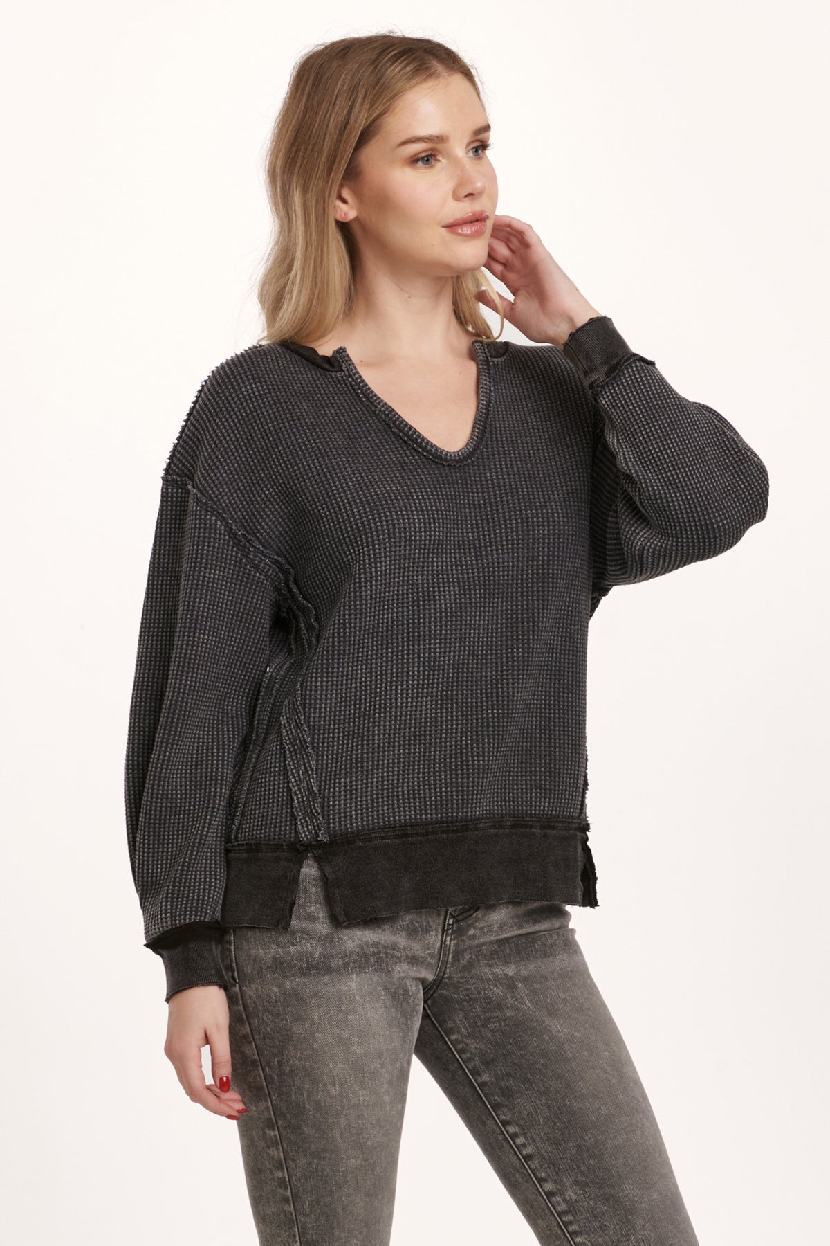 Thermal oversized top, drop shoulder long sleeve u-neck with raw seams & cut-outs, rayon stretch knit finish with contrast rib band at cuffs & waist. Playful features adding a touch of edgy, making the statement wherever you go! Solid color knit on relaxed fit