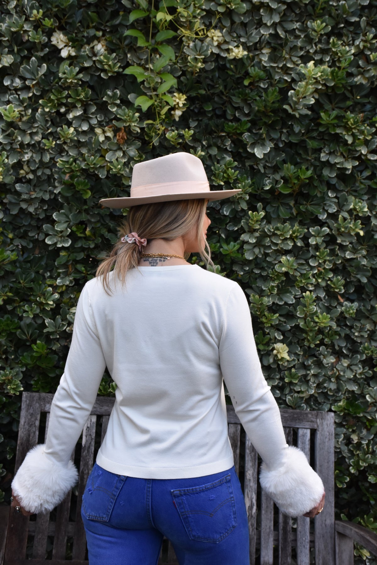 This crew neck sweater in soft vanilla combines comfort with style. The standout feature is the removeable fur cuffs, giving you flexibility to customize your look depending on the occasion. Wear them attached for added warmth and texture, or detach them for a streamlined silhouette. The classic crew neckline and neutral color make it easy to layer or pair with your favorite bottoms!