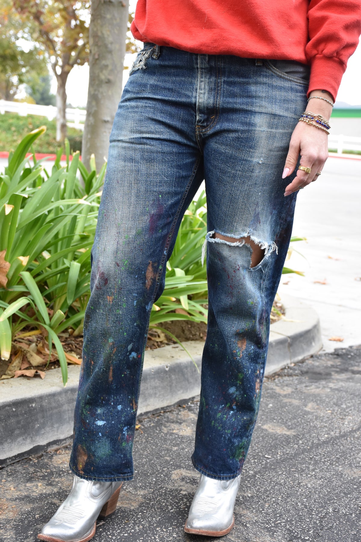 The denim color and/or distressing and paint splatter may vary slightly in appearance due to photography lighting.