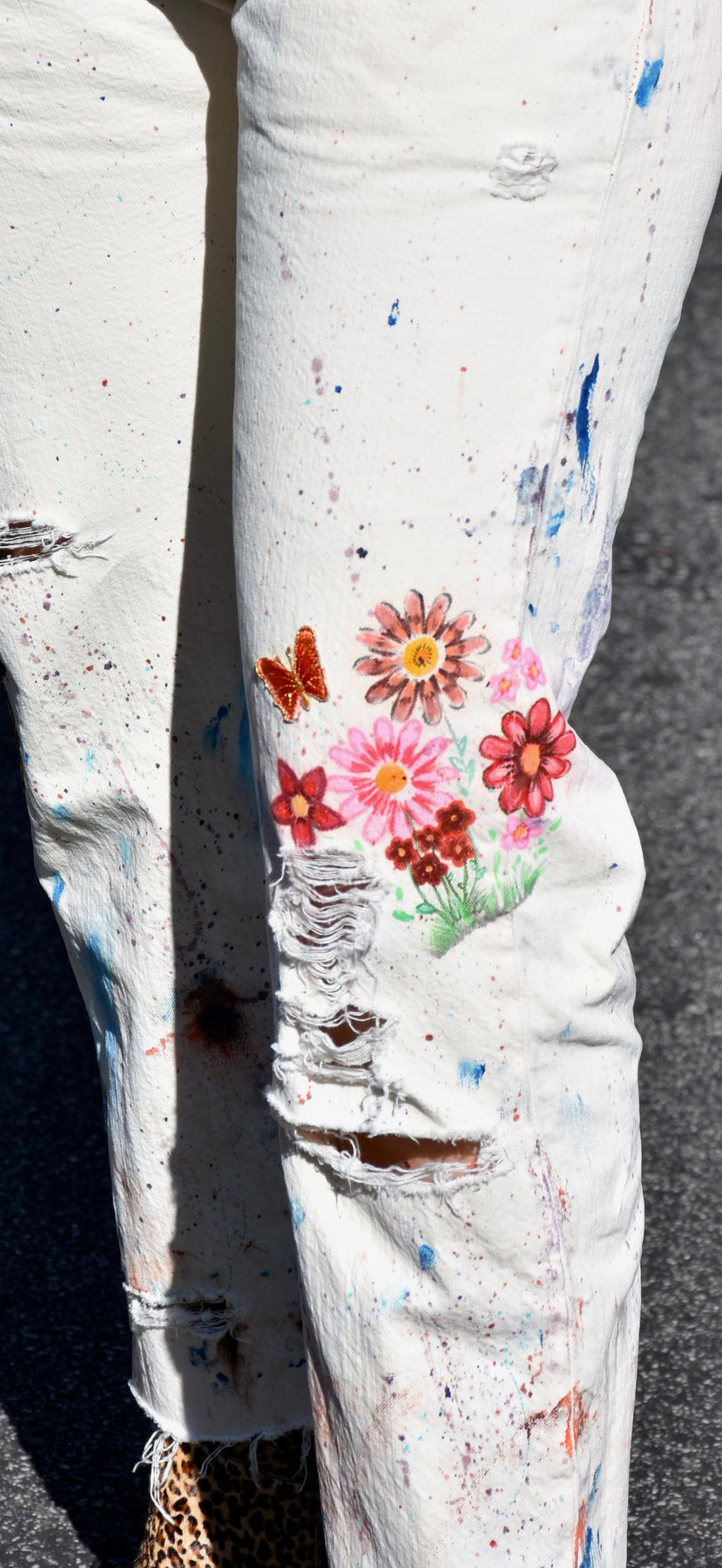All styles are either hand distressed, splattered with love, paint and/or bleached by Kelly and Lo.