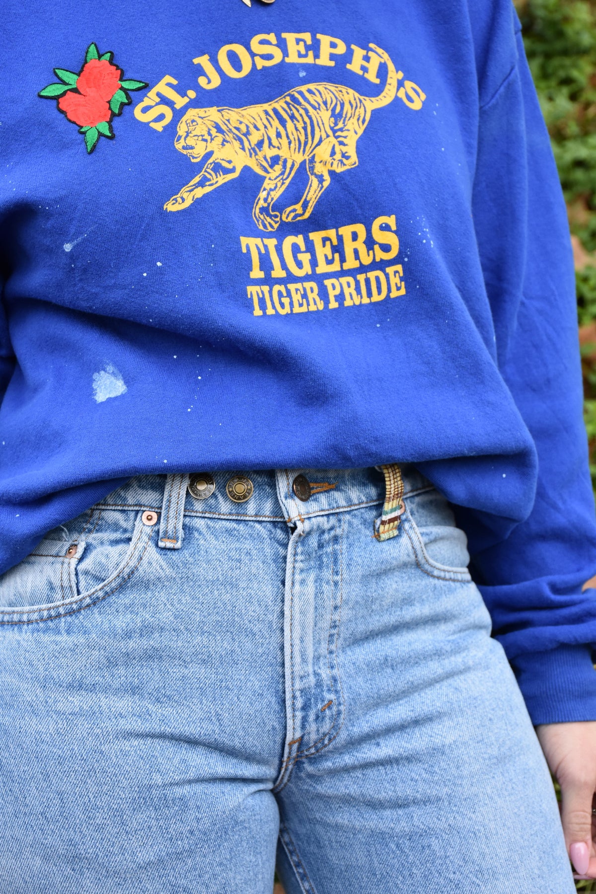 The denim color and/or distressing and paint splatter may vary slightly in appearance due to photography lighting.