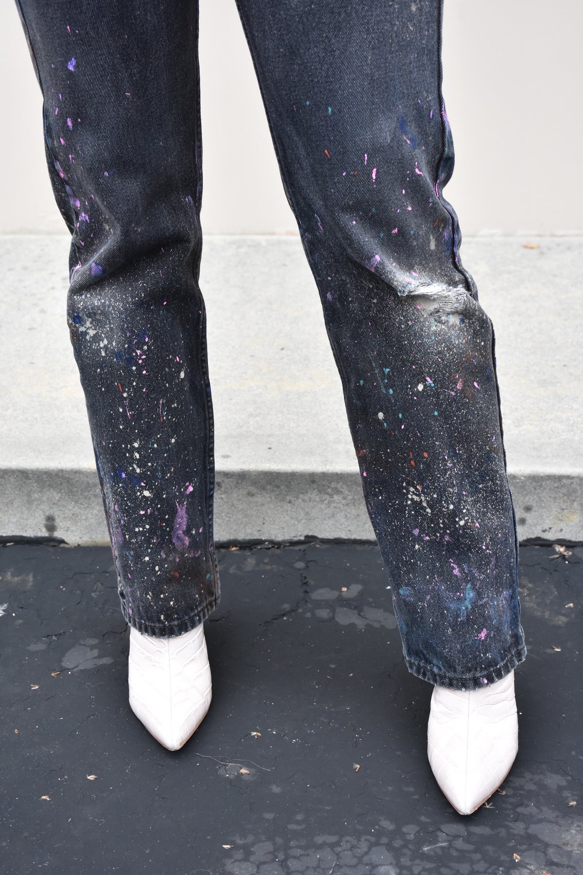 The denim color and/or distressing and paint splatter may vary slightly in appearance due to photography lighting.