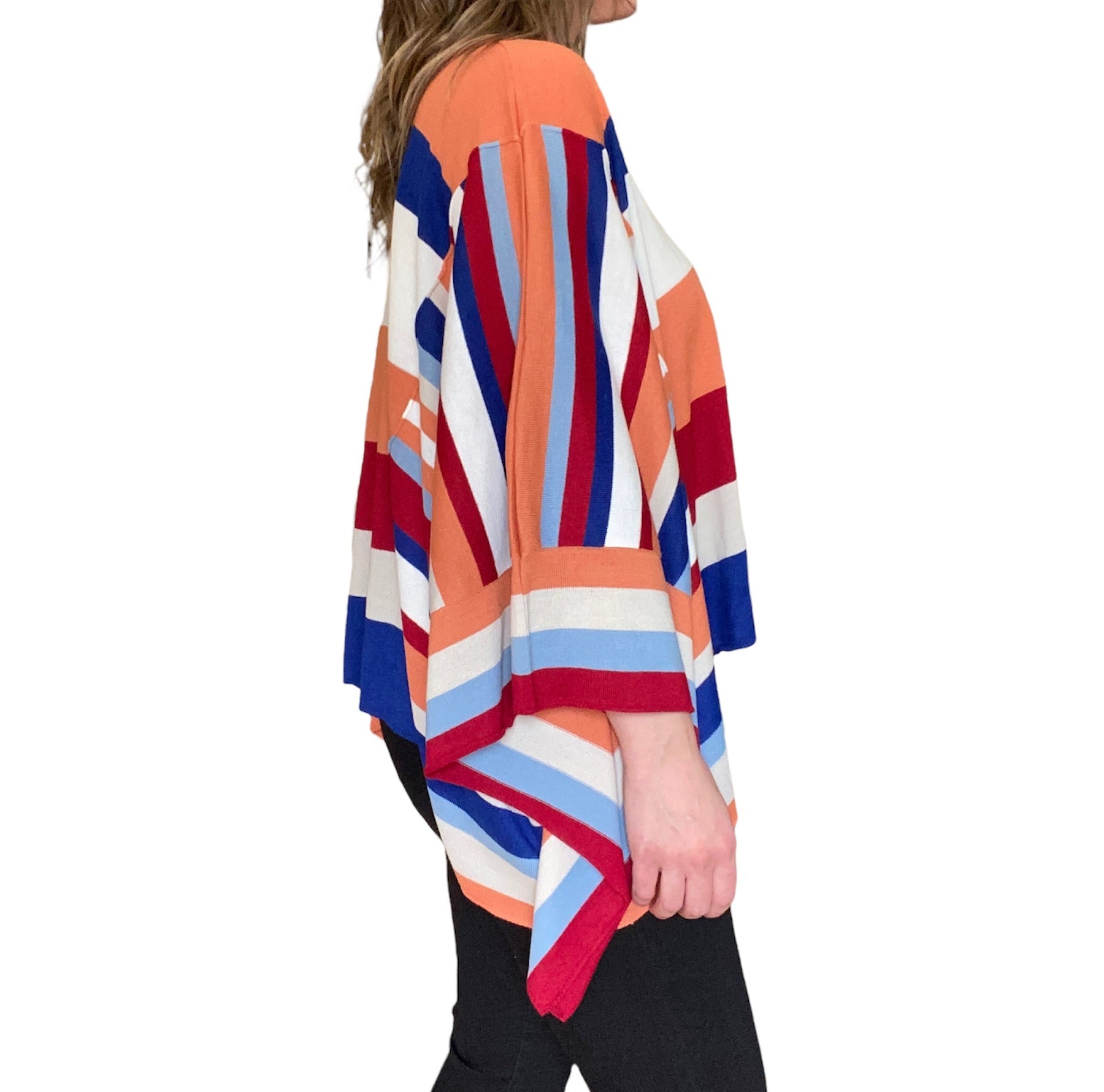 Oversize poncho with striped color blocking and V-collar neckline.