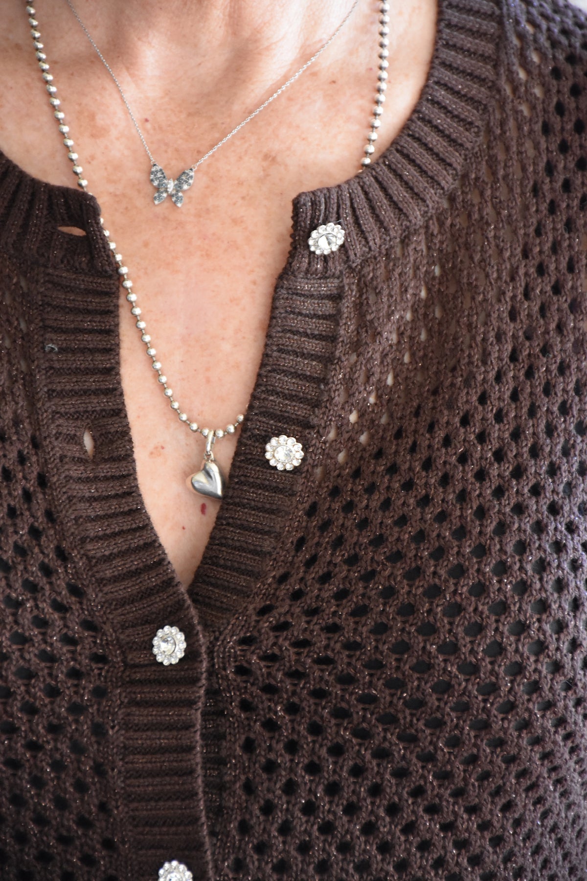 Elevate your everyday style with this open stitch cardigan in rich chocolate. Delicate metallic threading weaves through the design, adding subtle shimmer and visual interest to a versatile layering piece. The relaxed open stitch construction creates an airy, breathable feel perfect for transitional seasons. Slip it on over basics or dresses for an effortless touch of sophistication.