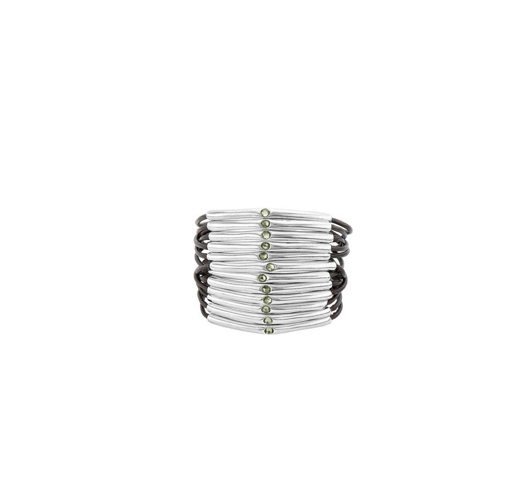 Bracelet with the characteristic boho chic style of UNOde50, composed of 12 strips of brown leather with 12 silver-plated metal covers that include Swarovski crystals and a comfortable button closure. A bracelet that you can wear with your most casual outfits. A jewel of UNOde50, made in Spain and 100% handcrafted.