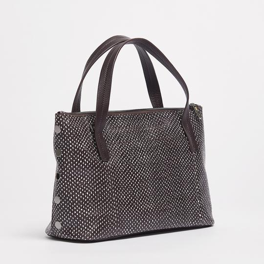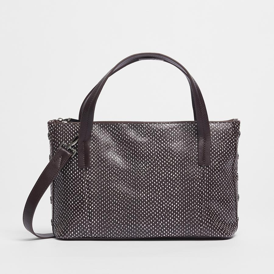 Meet Hammitt's easiest top-zip tote, now available in a manageable everyday size, with a crossbody strap for extra convenience. We accented a rich, smooth brown leather with purple undertones and a white dotted print. The finishing touch? Embossed snake detailing.