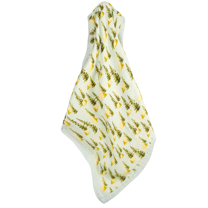 The ultimate in comfort, Milkbarn's generously sized Big Lovey Muslin Blanket in the Camping print allows for extra snuggles and cuddles.