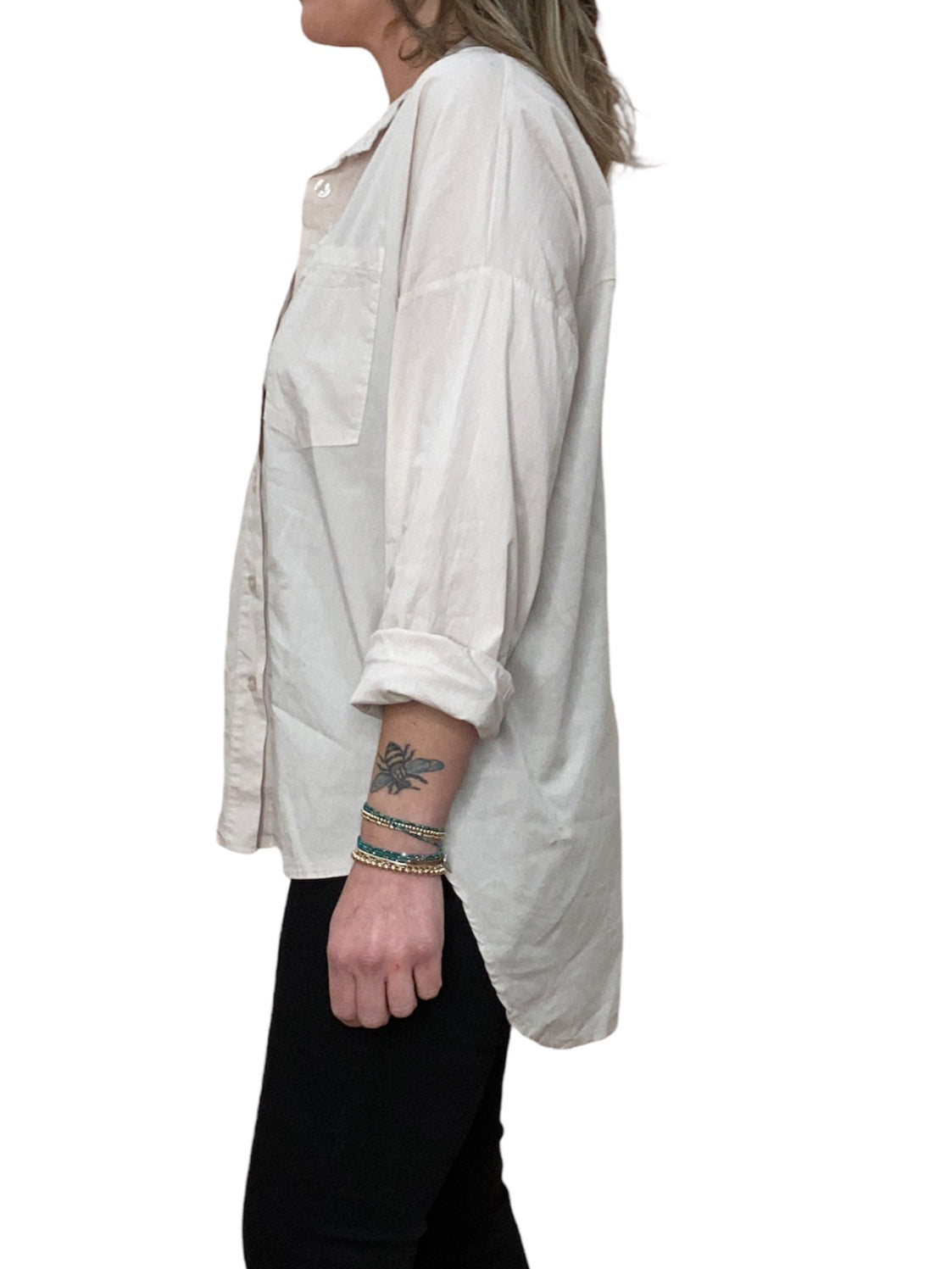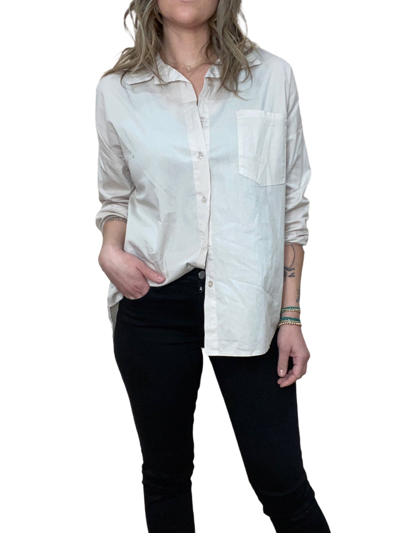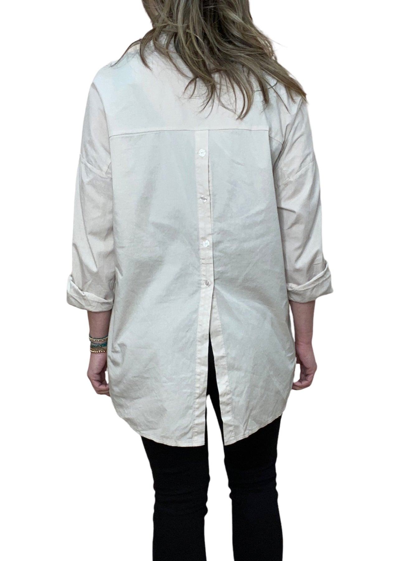 Button-Up Long Sleeve Shirt. Solid top with button-up closure and button detail on back, one front pocket, hem longer in back.