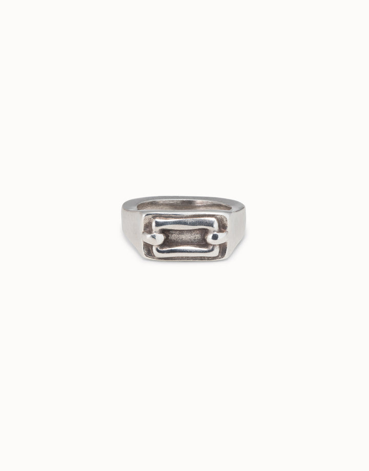 Sterling silver-plated signet-shaped ring with a double hook relief. 100% handmade in Spain by UNOde50.