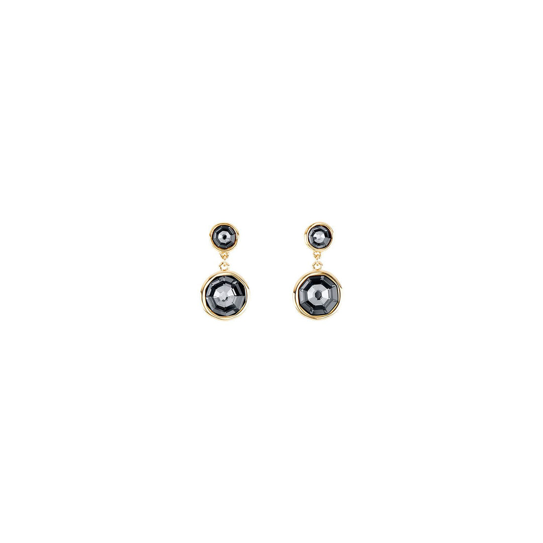 Two circular pieces of organic design and vertical arrangement make up these exclusive gold-plated metal earrings with SWAROVSKI ELEMENTS gray glass inlays A 100% handcrafted jewel that you can wear with any daily look, inspired by the most urban woman This complement has been made in Spain by UNOde50.