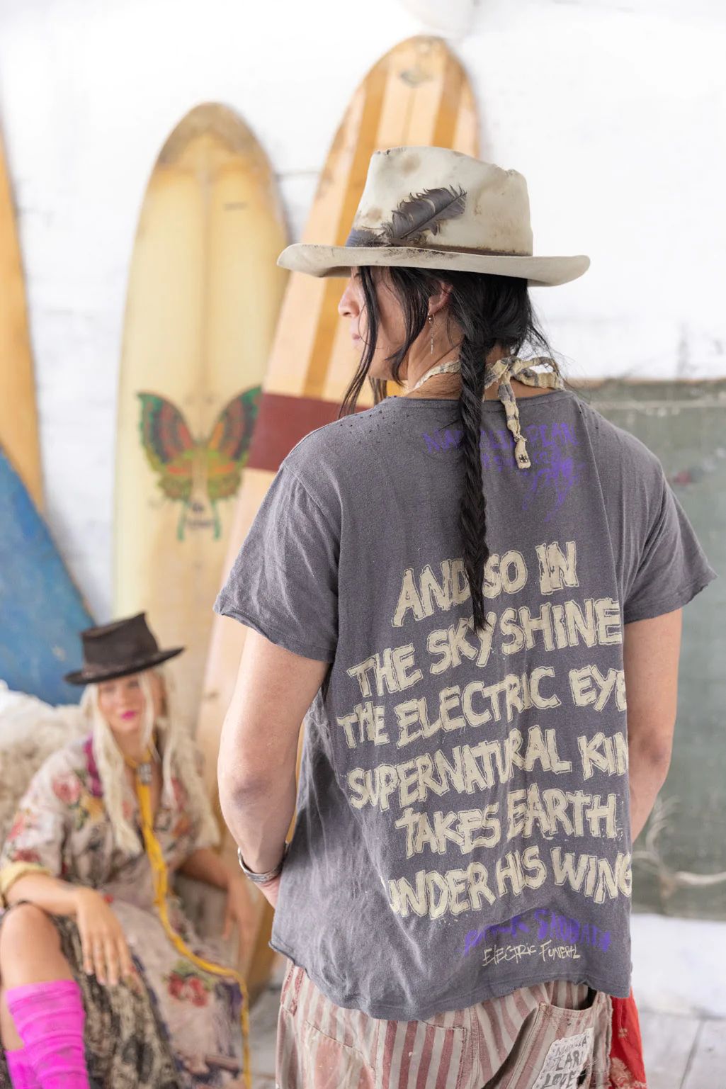 - Hand-Lettered Quote on Back: “And so in the sky/Shines the electric eye/Supernatural king/Takes Earth under his wing - Black Sabbath” *