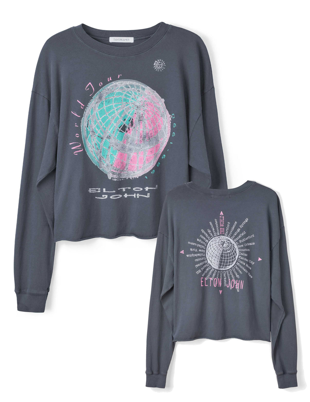 Nobody has more fun at an Elton John concert than Elton John. Part of what makes the Rocketman so iconic is that his on stage enthusiasm is simply unmatched. Audiences from the 1989-1990 world tour would often be met with a passionate and excited Elton who would play new material from the Sleeping With The Past album before it was officially released. Courtesy of the 80s and the official merch stand from the tour, we just unsealed this double-sided retro long sleeve that’s a major nod to a daring decade. If you are going real bold, pair with leggings or bike shorts to complete the 80s vibe.