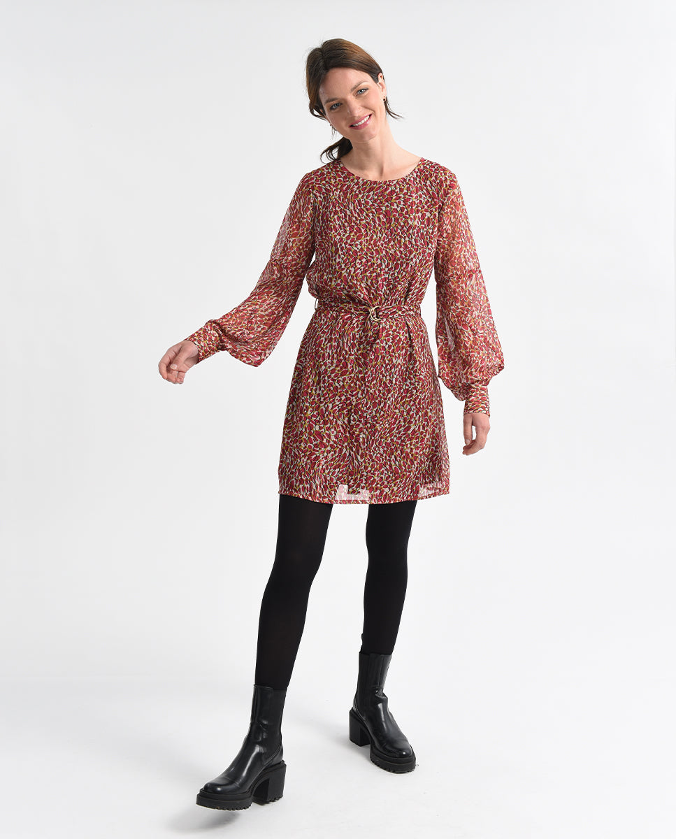 Molly Bracken's belted flared dress, chest darts and psychedelic graphic pattern on lined voile with long balloon sleeves with wide buttoned cuffs, a detachable buckle belt.