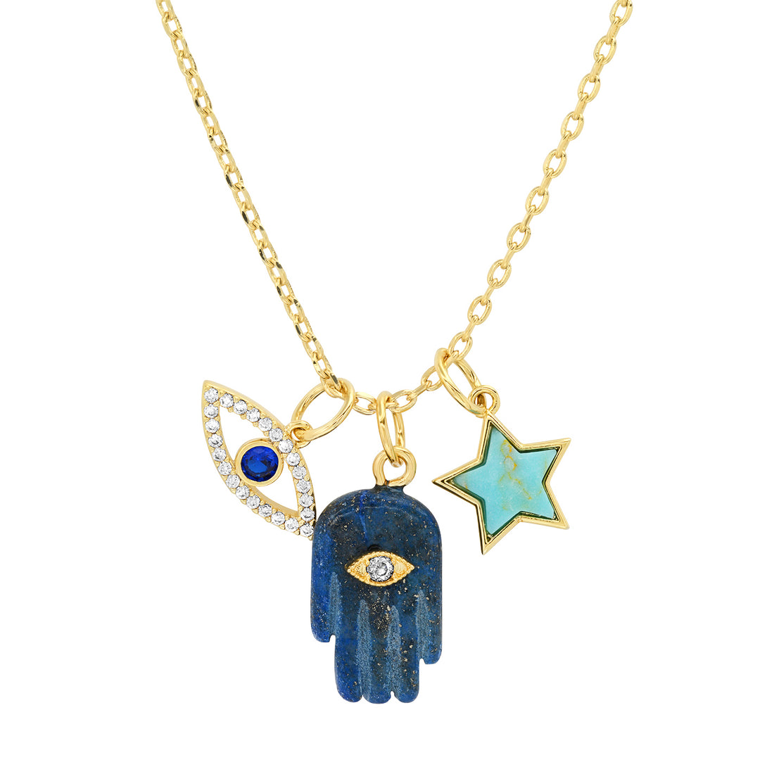 GOLD LAPIS HAMSA EVIL EYE CHARM NECKLACE