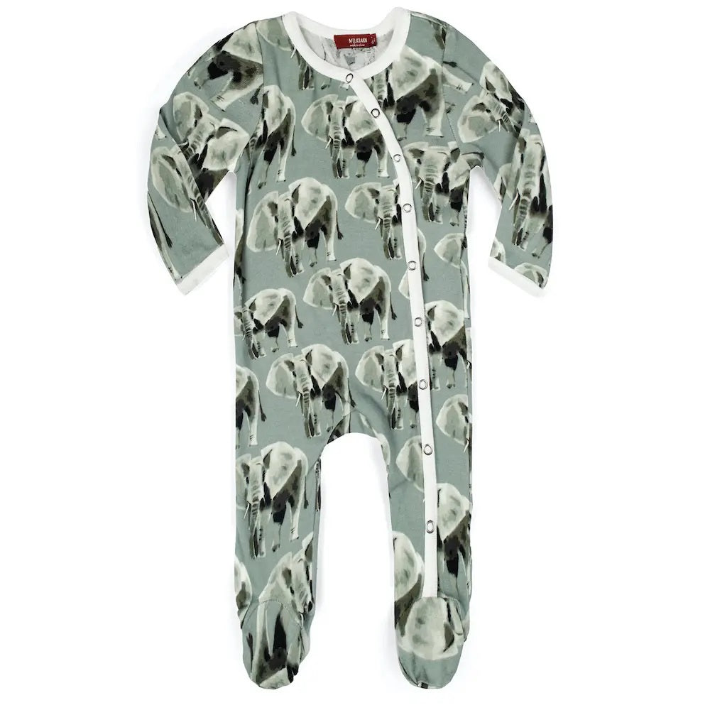 Milkbarn's newborn and baby organic cotton Snap Footed Romper in the Grey Elephant print blends design with functionality. With a closed foot detail, contrasting cuffs, and a stylized off-center seam, this timeless classic will envelop our little ones in soft and gentle comfort. The ring-snap closures allow for ease of changing and dressing.