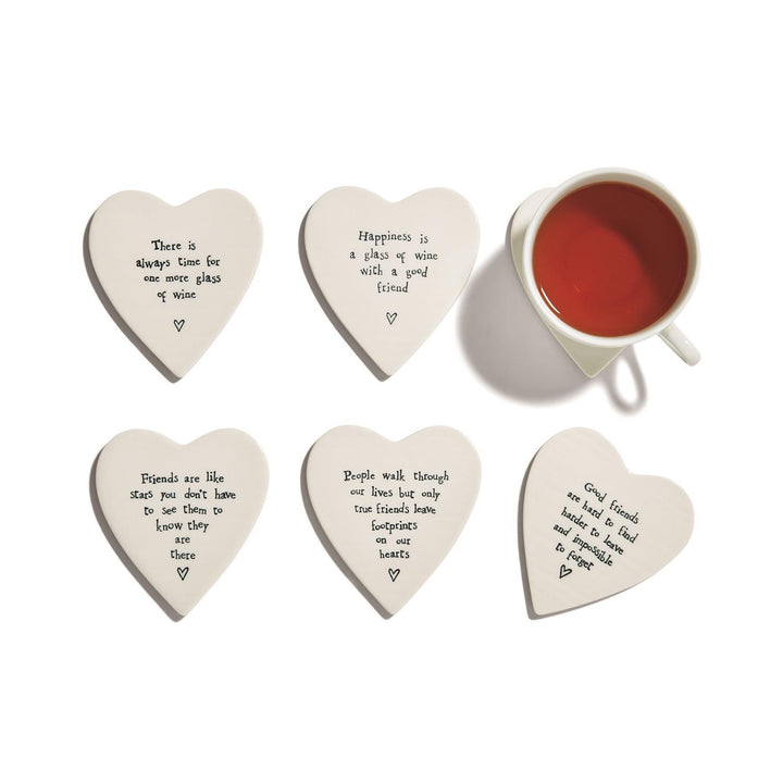 Fabulous white porcelain heart shaped drink coasters each with black text and illustrations. Makes a great gift for a special friend and family member. Display these sweet messages in your home.