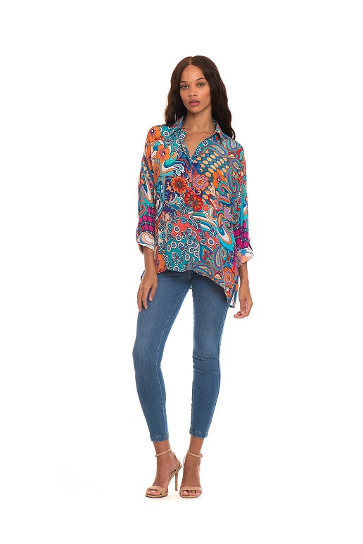 Wear this Tolani top as a classic button down or unbutton the lower buttons and tie the ends for a different look!