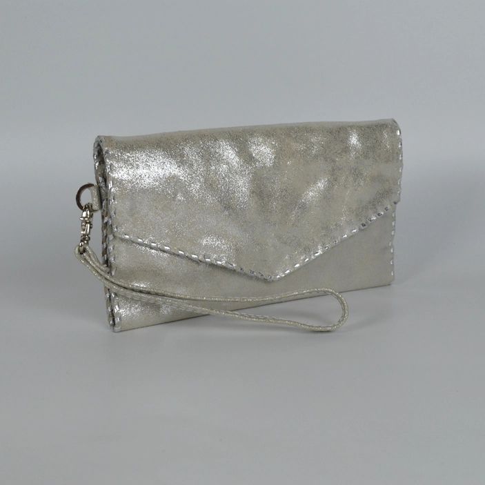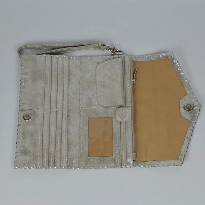 Artisan Handmade trifold wallet wristlet with cotton lining. Made with premium suede leather coated with a shimmering finish. Handstitched using leather strips creating beautiful whipstitch detailing.