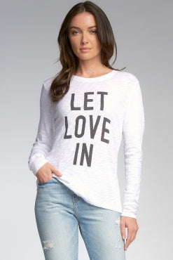 Long sleeve crew neck tee with graphic print saying "LET LOVE IN"