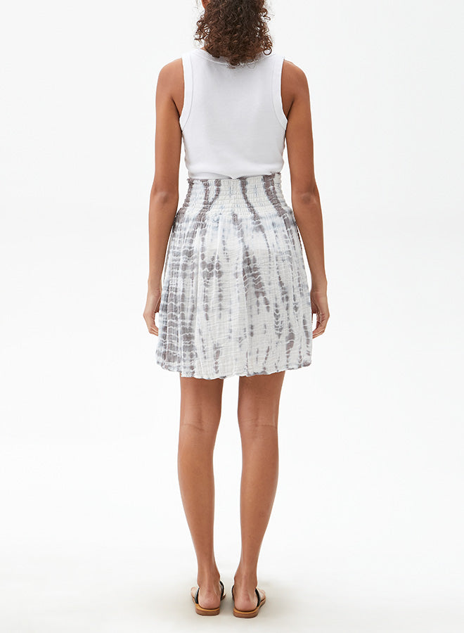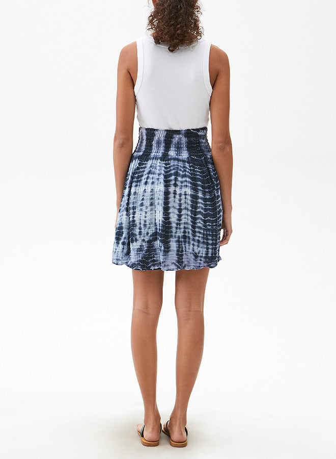 Shibori dye skirt in lightweight gauze fabric. Smocked detailing at top waistband.