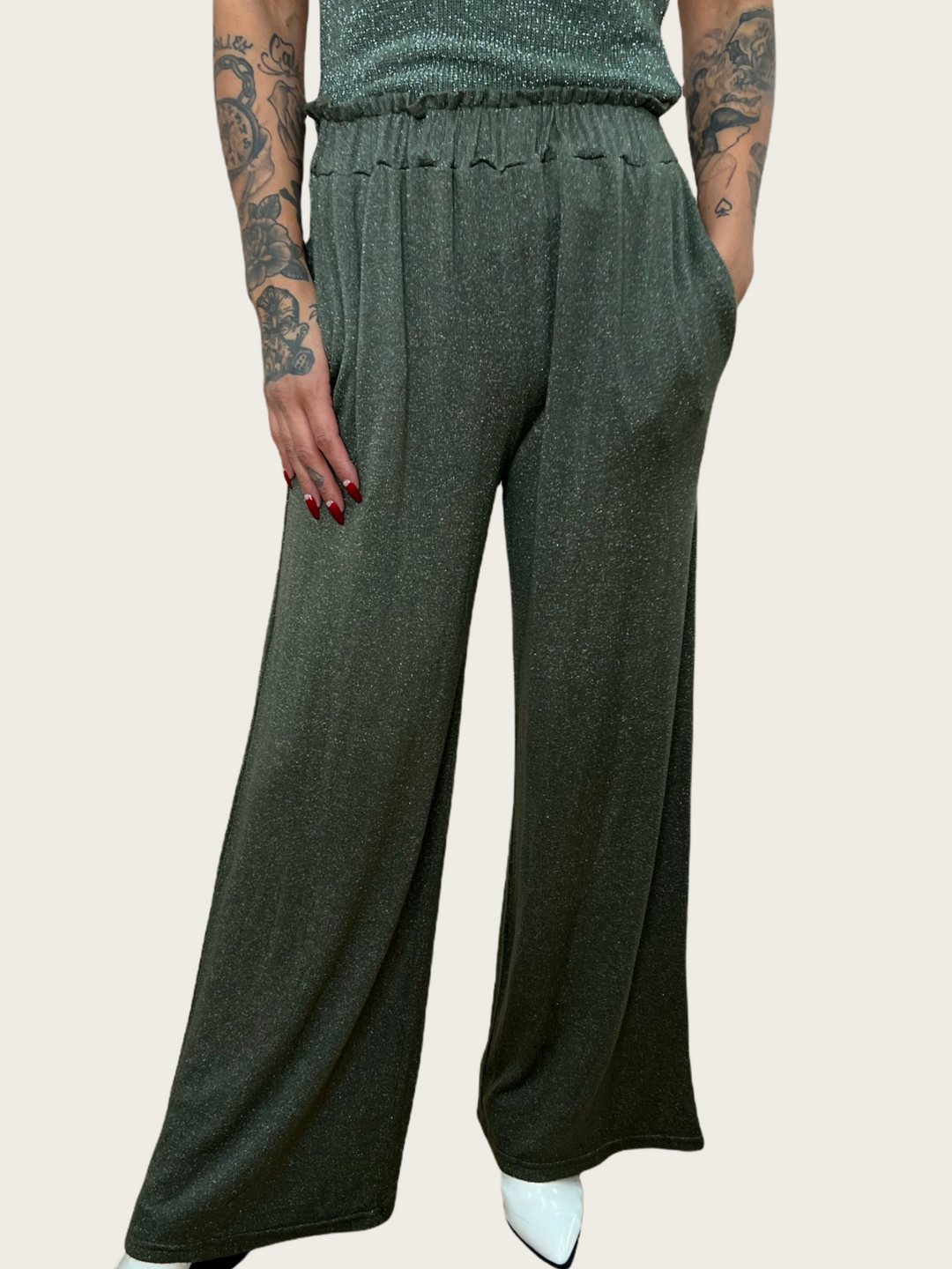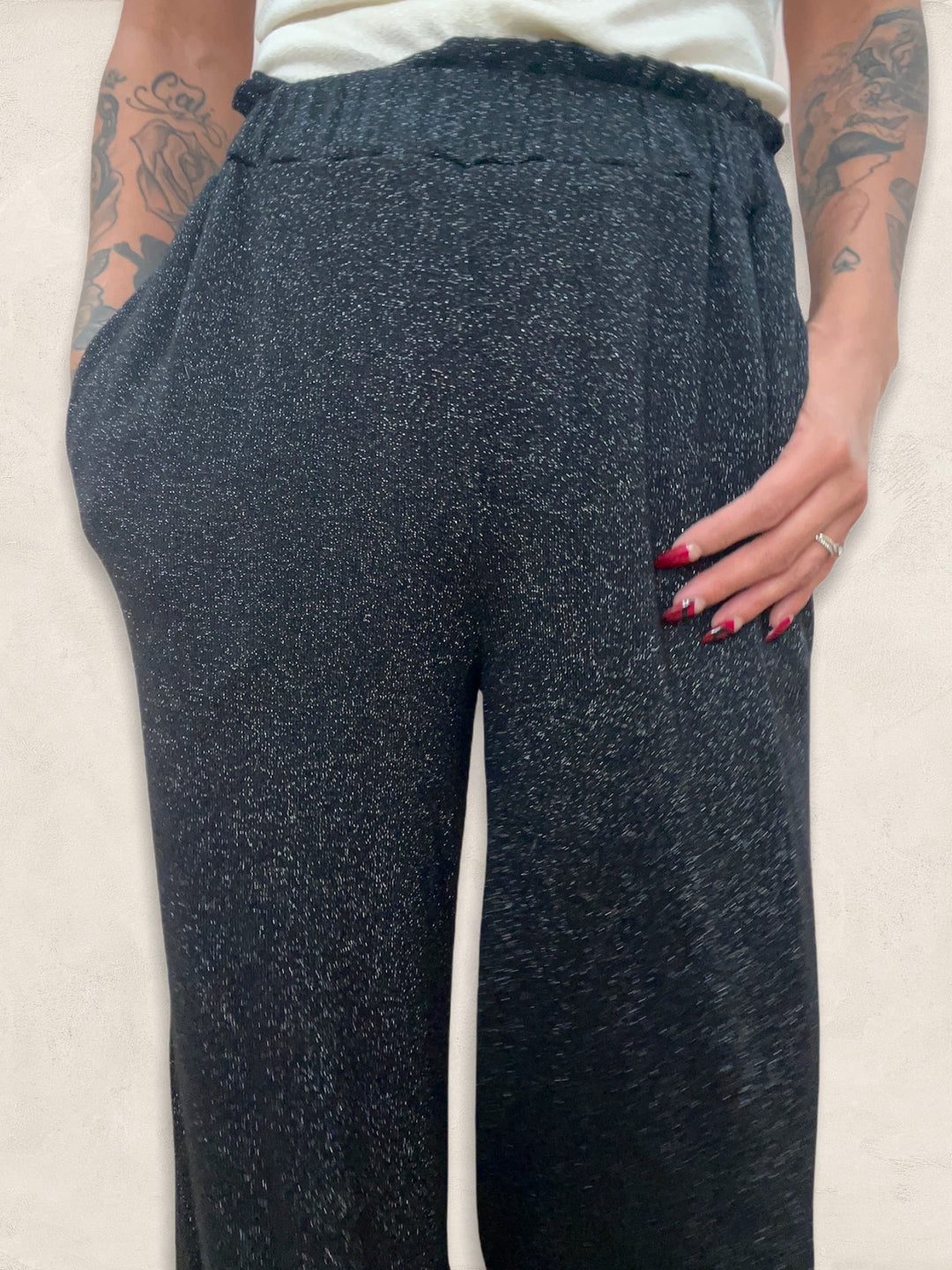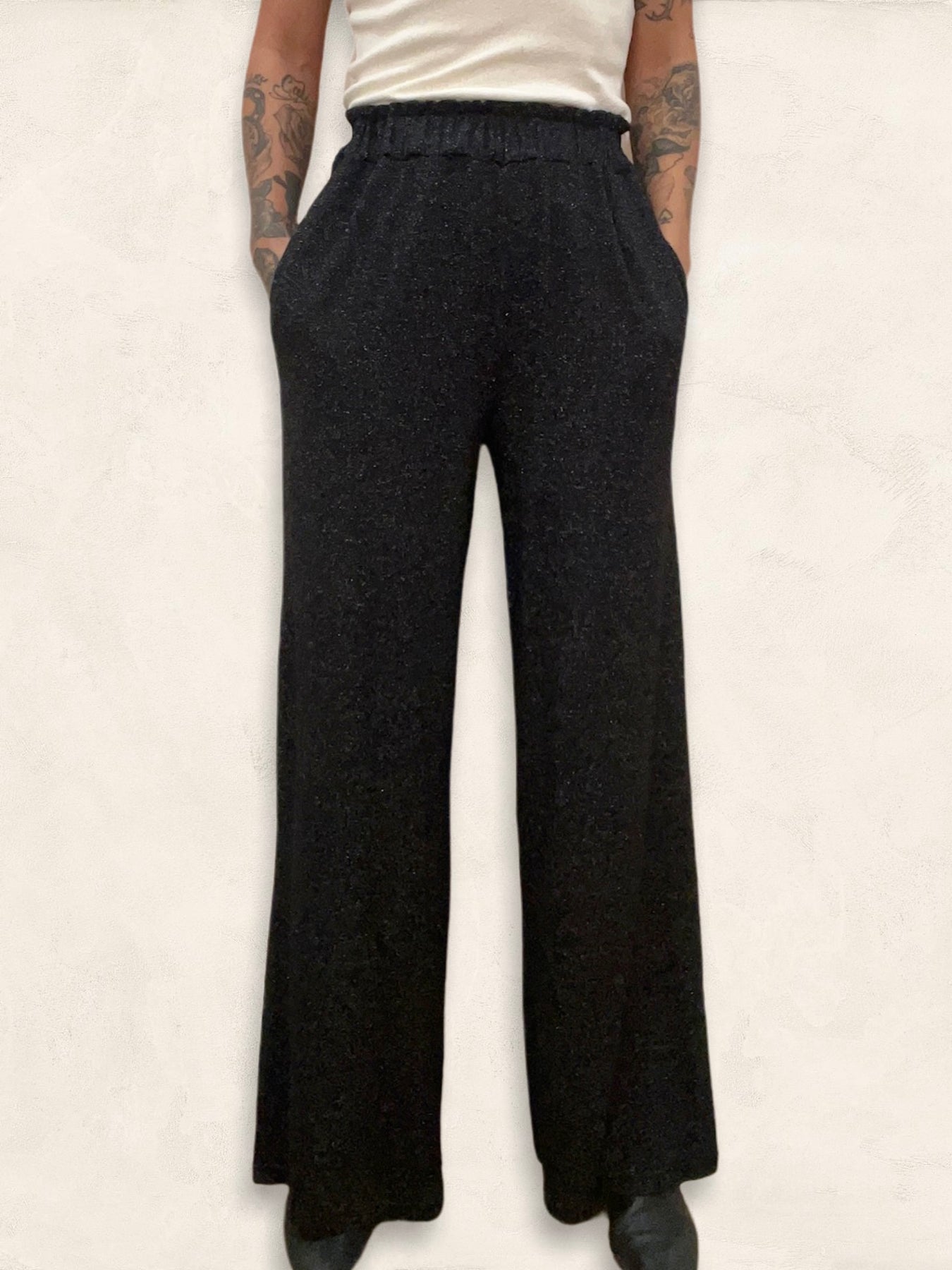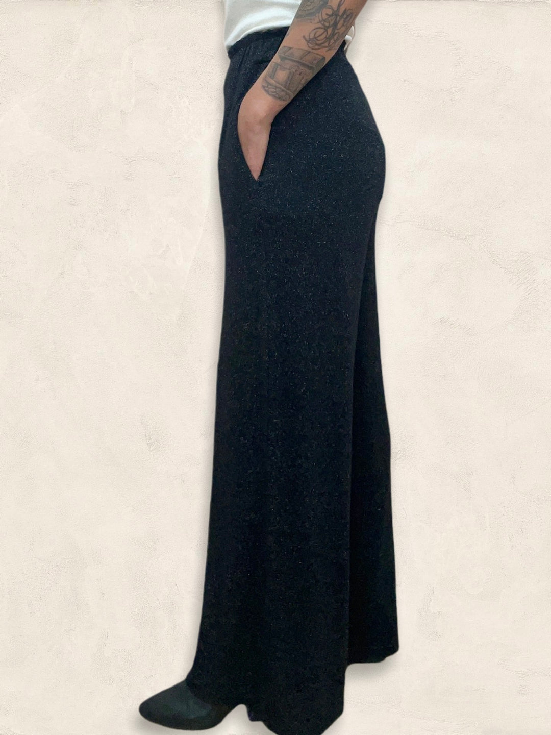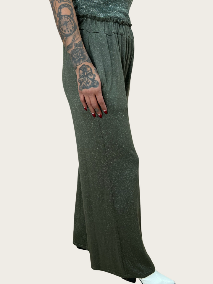 This fun and flirty soft pant can be worn all year long to add a little sparkle to your outfit. Features an elastic waistband, wide leg and lurex thread woven throughout. One size. Made in Italy.