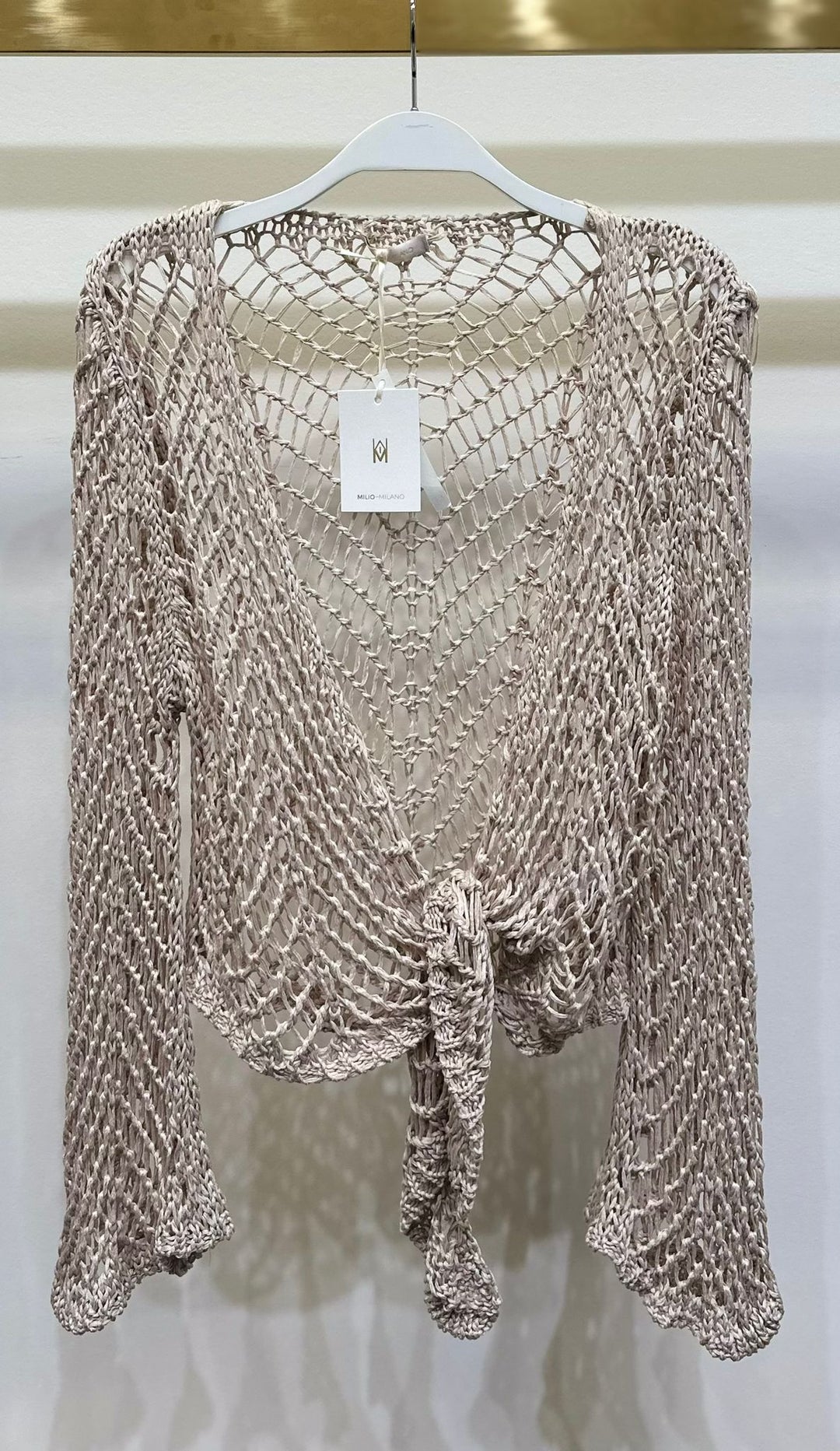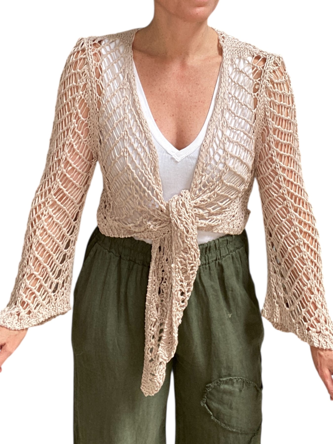 OPEN KNIT CROCHET TIE TOP WITH BELL SLEEVE-TAUPE