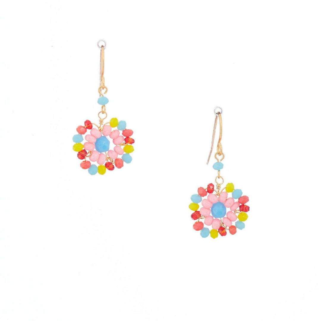 Colorful flower beaded crystal earrings with gold plated wire wrapping.