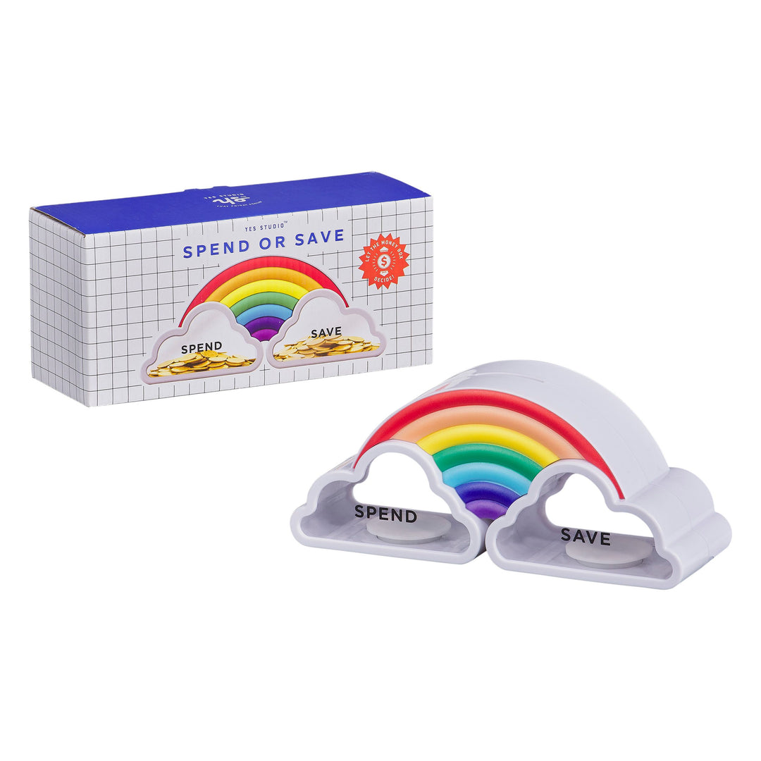 Spend’ or ‘Save’ Decision Money Box. Rainbow design.