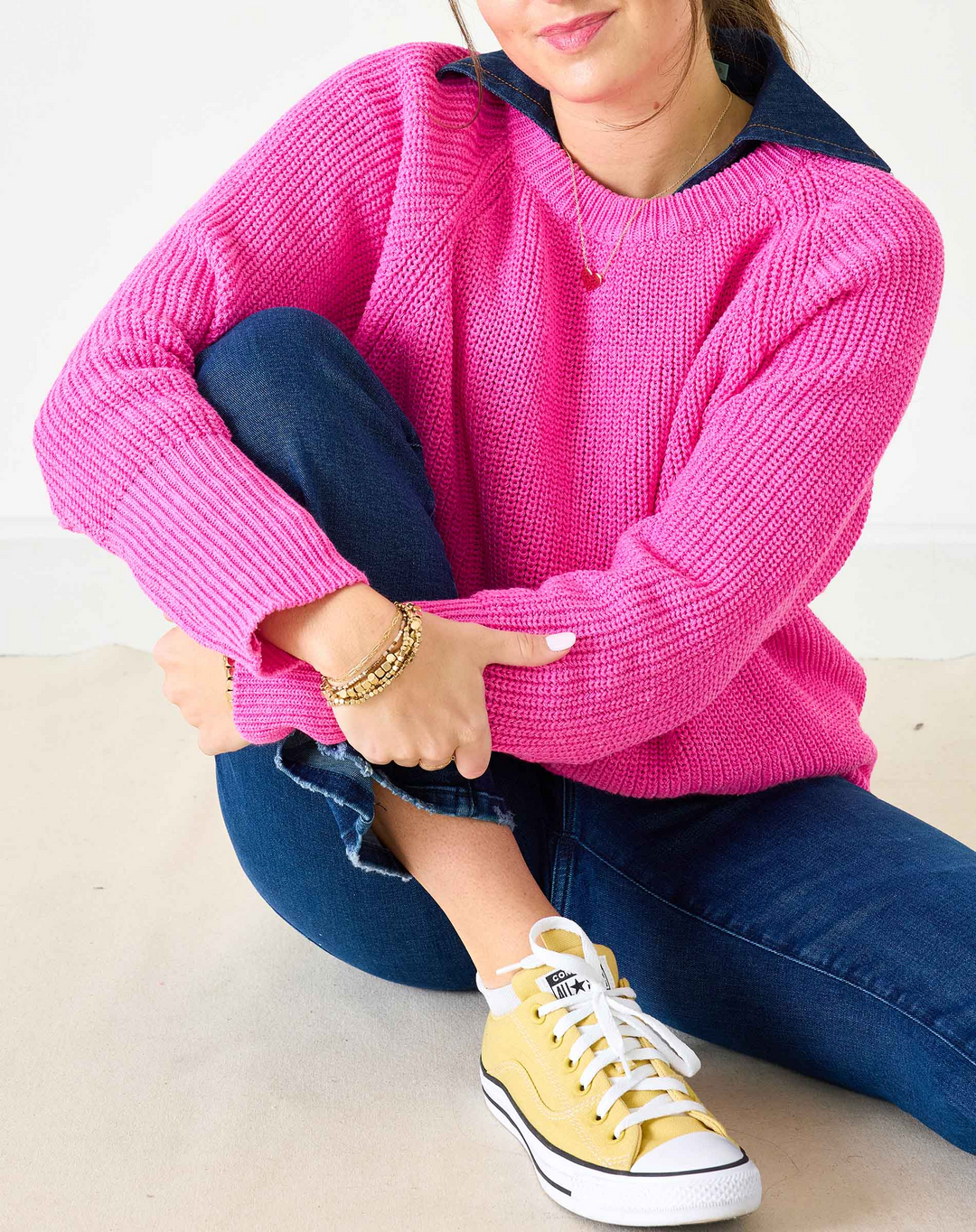 The crafted the perfect sweater for every trip by the sea. This fisherman knit in an intentionally oversized fit will keep you warm without making you hot. Throw it over your shoulders for a pop of color, wear it on it's own or layer it, this Salty Cotton Crewneck is made for summer.