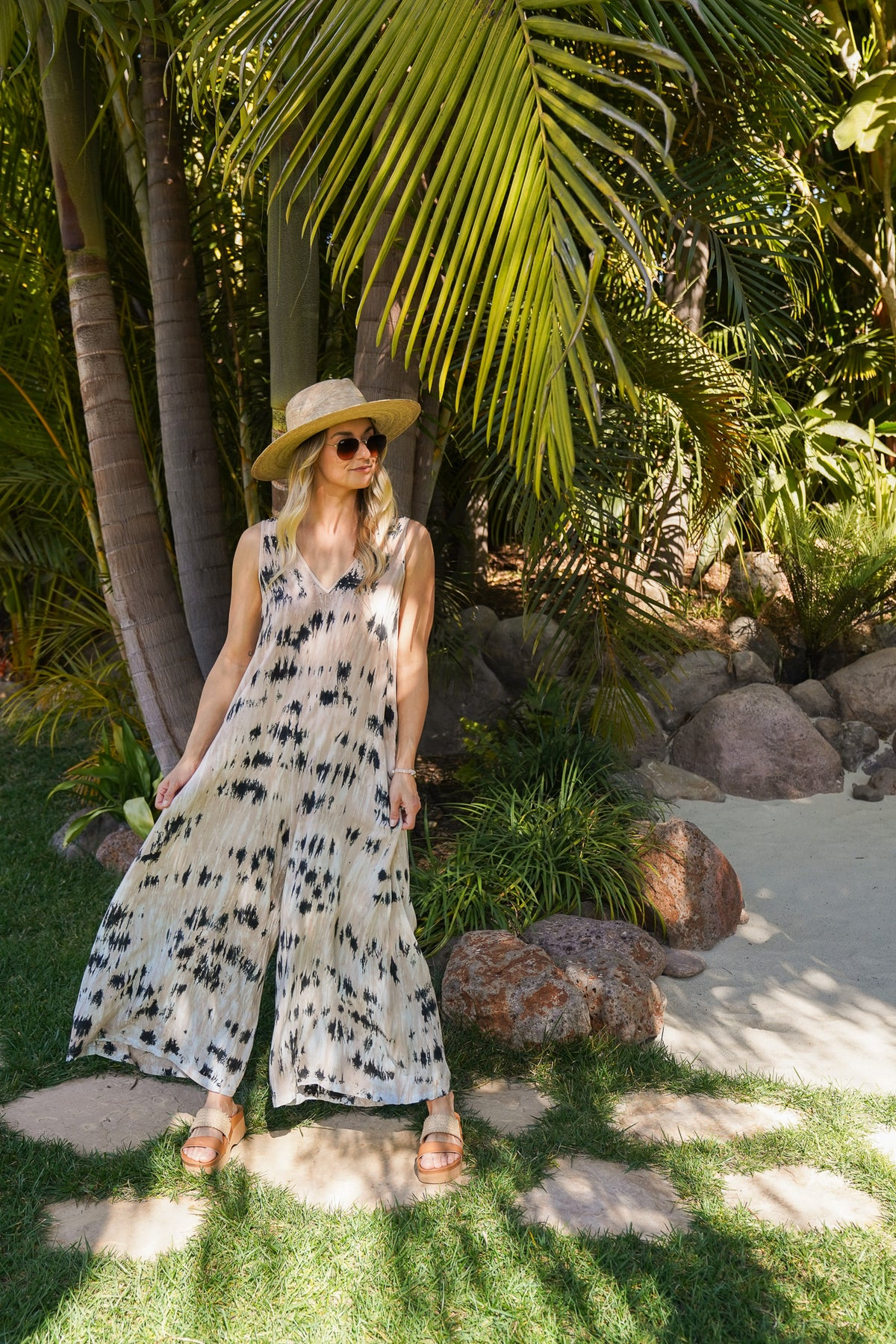 Slip into effortless coastal vibes with the Santorini Jumpsuit. Featuring a tie-dye design and hidden pockets, this one-piece is perfect for laid-back days or beachside evenings. Pair it with sandals and minimal jewelry for a breezy, stylish look.