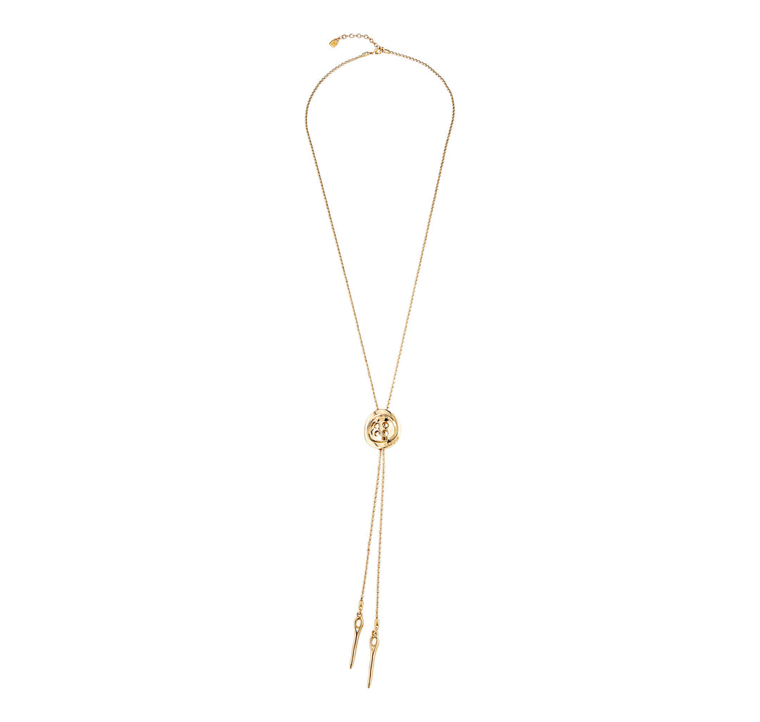 Original long necklace, articulated chain of metal added in gold and topped at the end by a medium button hanging two needles. An accessory that you can wear with all your outfits and with which you will not go unnoticed. An exclusive design by UNOde50, made in Spain and made in a 100% handmade way.