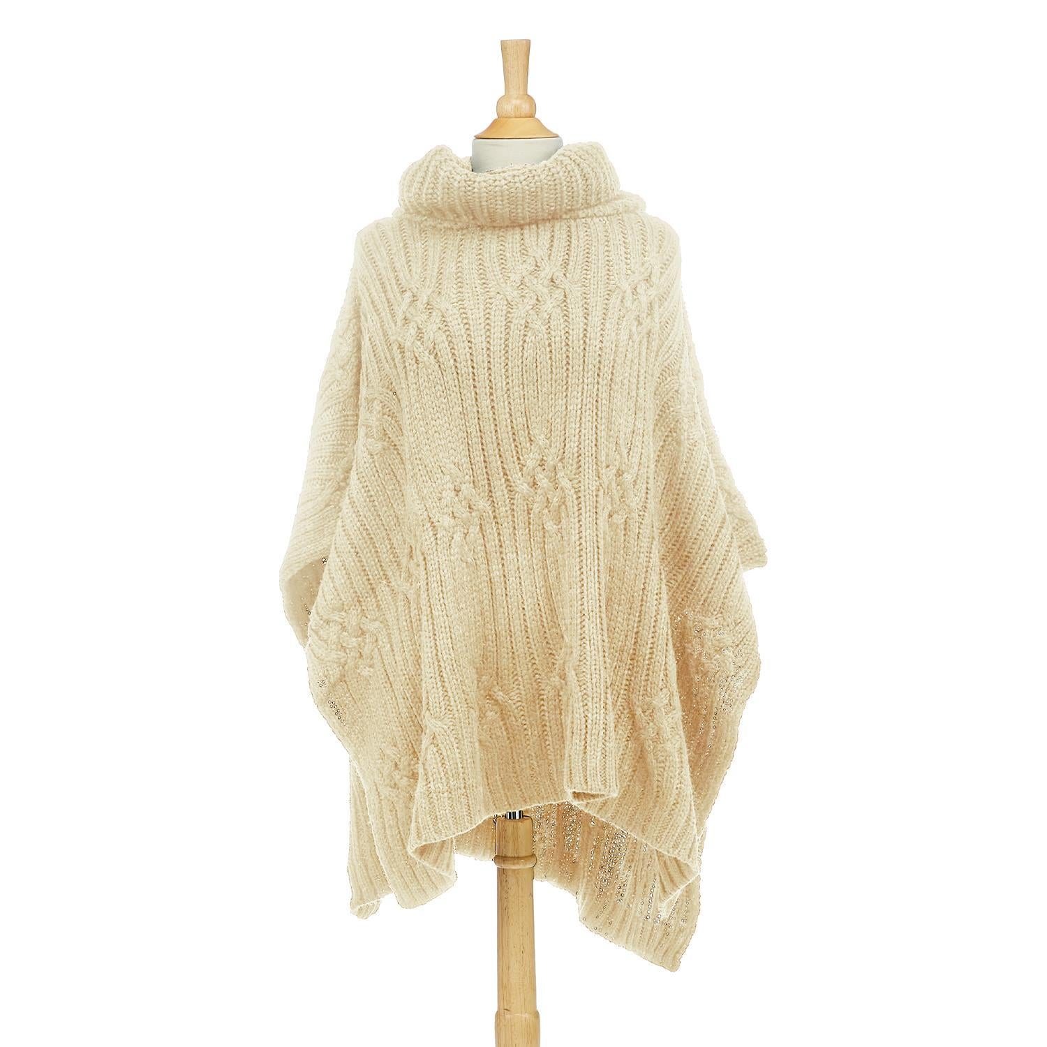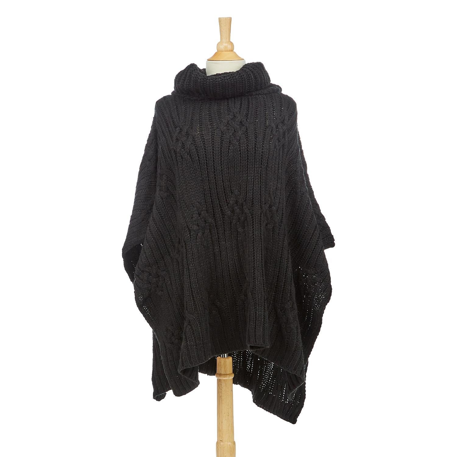 Stay warm and toasty with this turtleneck cable knit poncho. In a slightly oversized silhouettes, this can easily be layered over any outfit for added warmth and comfort.
